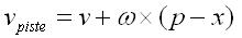 Kaavoissa ilmenee myös symboli v, joka tarkoittaa tällä kertaa kosketuspisteen nopeutta. Tiedämme kyllä kappaleen nopeuden ja kappaleen pyörimisnopeuden. Kuinka laskemme näistä yksittäisen (kappaleen pinnalla olevan) pisteen nopeuden? Jos kappale ei pyörisi, olisi kappaleen minkä tahansa pisteen nopeus sama, kuin kappaleen itsensä nopeus, mutta pyöriminen mutkistaa asioita. Kappaleen pisteen p nopeus lasketaan kaavalla: