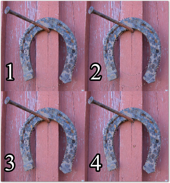 2. Paina Alt-näppäin pohjaan ja vedä nyt hevosenkengän sisäreunaa noudatteleva soikiovalinta kuvaan. Tällä tavoin leikkaat valinnasta kengän aukon pois. Muista, että voit päästää Alt-näppäimen irti heti kun olet alkanut piirtää valintaa.