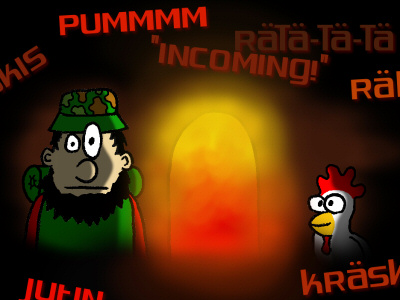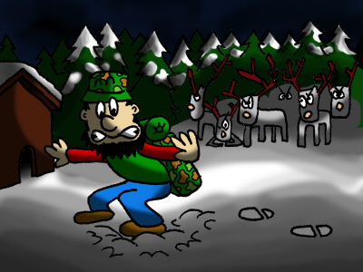 Sitten kaukaa alkoi kuulua lähestyvää lentokoneen ääntä, jotain pienten ukkojen mesoamista ja kanalan takaa metsästä lähestyviä kommandon askelia. "Matalaksi!" huusi Pekka ja Jorma heittäytyi samalla kanalan lattialle mahalleen. Alkoi kuulua pommikoneiden konekiväärien papatusta ja putoavien pommien ääntä. Yhtäkkiä myös pikku-ukot alkoivat mesoamaan, ja aseiden pamahtelu ja ohjuksien räjähtely oli kaksi kertaa voimakkaampi mitä pommikoneissa. Samassa alkoi kuulumaan aivan kanalan vierestä M-16:n papatusta. Kommando, joka suorittaa erinäisiä tehtäviä ympäri maailmaa, oli kuullut kutsun ja saapunut auttamaan. Yhtäkkiä jonkun matkan päästä alkoi kuulumaan suomalaisia voimasanoja ja konekiväärin papatusta. Myös Ryssän kauhu oli saapunut apuun. Jorma ja Pekka kuuntelivat sotimista muutaman minuutin, kunnes se lakkasi kuin talvisota saman nimisessä elokuvassa. Jorma ja Pekka poistuvat kanalasta huomattuaan oviaukosta, että poroista taisi tulla käristystä. Ulkona ei enää tuoksunut kylmä aamuöinen kirpeä pakkasilma vaan vain ja ainoastaan ruuti. Katsoessaan taivaalle Jorma huomasi suomalaisen, saksalaisen, brittiläisen ja japanilaisen pommikoneen lentävän yhdessä rivissä ilmassa. Nyt he olivat väliaikaisesti unohtaneet triplanemaisen faktan joulun alla, että heidän pitäisi taistella keskenään, ja olivat tulleet Jorman apuun. Oviaukon suulla seisoi M-16:ta pitelevä siniseen pukuun sonnustautunut kommando. Pikku-ukot jaksoivat vieläkin mesota pihalla - nyt keskenään. Metsänrajassa Ryssän kauhu ampui vieläkin poron raatoja ja kiroili tapansa mukaisesti. "Kiitoksia sinulle Pekka ja teille hyvät ystävät!" Jorma ilmoitti tyytyväisyytensä. "Tosin, mistä Pukki saa uudet porot täksi vuodeksi, jos teitte kaikista selvää?" kysyi Pekka. Kukaan ei vastannut Pekan kysymykseen. Mikä on (porotokka)5/8 - (porotokka)3/8? Entä paljonko on poron aallonpituus? Vaikuttaako se poronlihan säilyvyyteen? Voittaako villisika onnenpyörän? Kolmannessa osassa miehet ovat raavaita ja liha raakaa. Jatka luukuttamista!