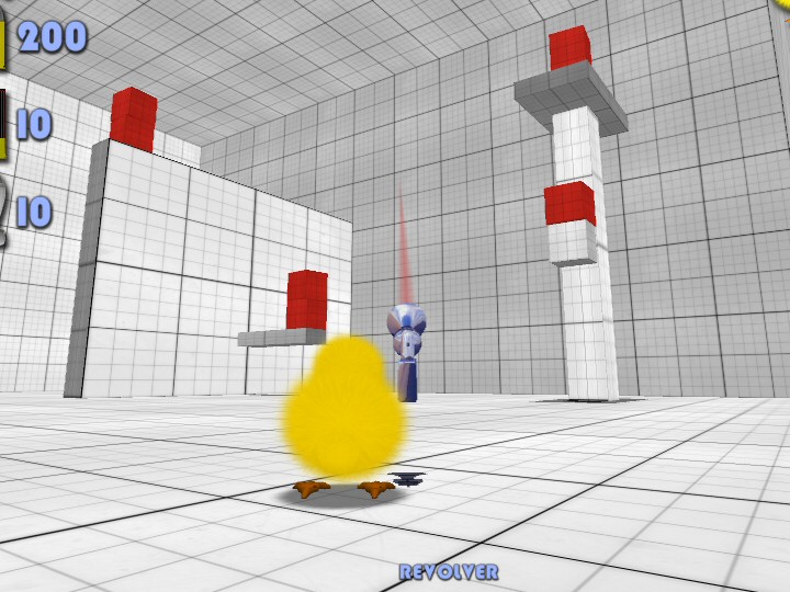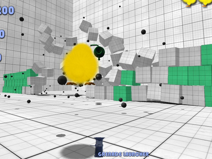 Grafiikkapuolella peli suoriutuu sitten jonkin verran mallikkaammin. Kananpoika on söpö, ja aseet näyttävät sopivan koomisilta. Valitettavasti muu grafiikka on melko tylsää harmaata massaa, jota sävyttävät lähinnä siellä täällä olevat punaiset laatikot. Myös varjot käyttäytyvät joskus hieman omituisesti. Lisäksi singonammuksen räjähdys on melko lattea. Mitään räjähdystä ei nimittäin edes ole, vaan kranaatti yksinkertaisesti sylkee ison kasan pieniä kuulia, jotka lentelevät ympäri kenttää. Pulmaa kerrakseenJostain syystä suurin osa Kumoonin kentistä on melko helppoja. Kentän läpäisemiseen saattaa usein riittää hyvin tähdätty singon kranaatti ensimmäisenä laukauksena. Jos se ei vielä riitä, niin usein tarvitaan vain pari seinän kautta kimmotettua revolverin laukausta ja kaikki kentän laatikot ovatkin jo kumottuja. Vain muutamissa kentissä on todellista haastetta, kun osa laatikoista on sijoitettu lähellä katonrajaa oleville tasanteille.