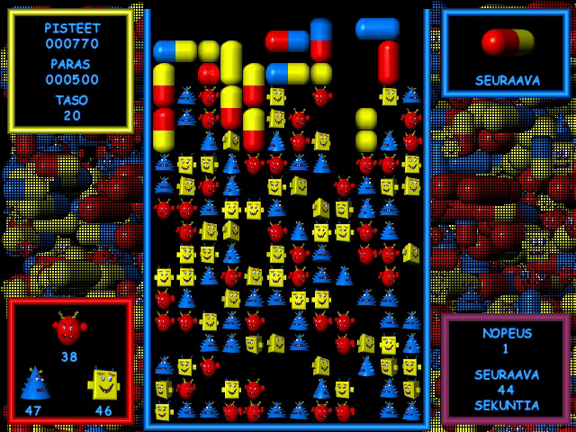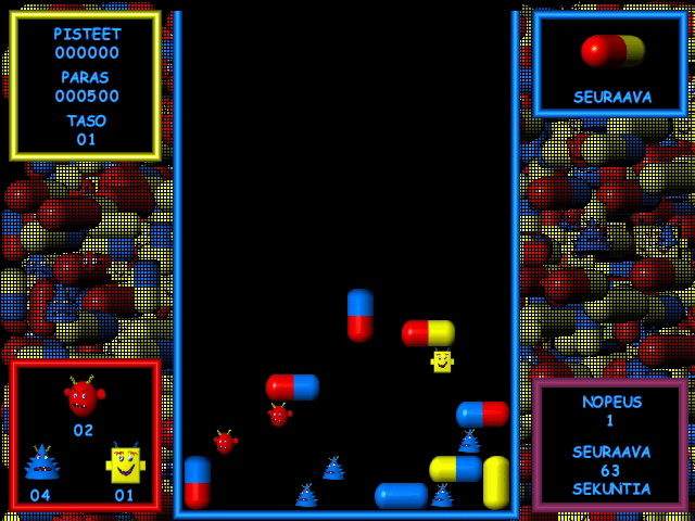 On aika tuhota hirviöitä värikkäillä kapseleilla! Heeetkinen, olenko kuullut tällaisesta ideasta aiemminkin? Taidan olla, pilttinä vuonna 1990 kasibittisen Nintendon Dr. Mario -pelissä. Päästäänkin siihen, että Jani Immosen Capsule voi olla kahta asiaa: se voi olla häpeilemätöntä plagiointia tai sitten iättömän peli-idean viisasta uudelleenkierrätystä. Kallistuisin jälkimmäisen suuntaan, sillä monellako edelleen se Nintendo-vanhus toimii? Kapselilla päähänCapsule näyttää ensin varsin paljolti Tetrikseltä. Pelialue on samanlainen, ja pelaaja ohjaa yläilmoista tippuvia palikoita haluamiinsa paikkoihin. Pisteitä kerätään pinoamalla samanvärisiä palasia tarpeeksi pitkiksi putkiksi. Varsinainen ero Tetrikseen tehdään siinä, että Capsulen tasot ovat erillisiä kokonaisuuksia, eikä peli näin tunnu jatkuvan näennäisesti loputtomiin. Capsulea voi pelata myös suomenkielisenä.