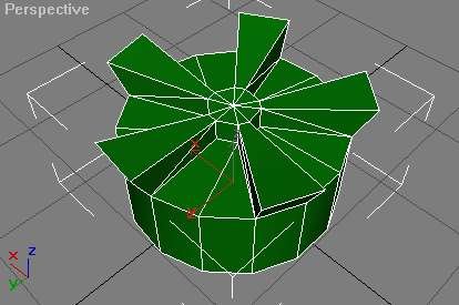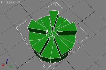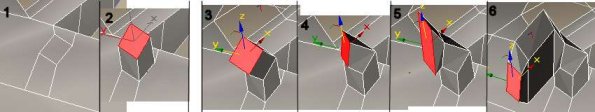 Tämän jälkeen hitsaa pisteet, jotka sijaitsevat viiden äsken extrudoidun nelikulmion kärjissä alas, niin, että saat ulokkeista kaltevia. Valitse sitten ulokkeiden välissä olevat polygonit ja extrudoi niitä sisäänpäin. Poista turhat polygonit ja korjaa hitsaamalla pisteiden paikat. Valitse ulokkeiden uloimmat pisteet ja loitonna niitä toisistaan symmetrisesti scale-työkalulla, samalla, millä alussa. Katso seuraavaa kuvaa, jos et oikein mitään ymmärtänyt.