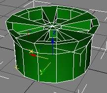 Renkaat teemme kokonaan erikseen. Tallenna autosi ja paina resettiä. Ei siis sitä reset-nappulaa, joka sijaitsee koneesi kyljessä vaan file-valikosta reset. Eteesi aukeaa puhdas pöytä. Teemme renkaat erikseen erillisenä tiedostona, koska auto olisi vain aivan turhaan tiellä. Siis. Koolla ei ole nyt juurikaan väliä. Tämä rengas tulee näyttämään kutakuinkin Moottori-lehden numeron 11-2001 sivun 16 Peugeotin renkaalta. (Rekkari 813NTG75) Jos sattumoisin sinulle tulee kyseinen lehti, niin sieltä voi katsoa mallia. Kirjastotkin on toki keksitty… Aloita silti tekemällä ensin sylinteri, öö… olikos se oikeasti lieriö, vai..? No, leikki sikseen, tämä on totista renkaantekoa! Siis sylinteri – putki ilman rööriä. Halkaisija 10 ja korkeus 10. Laita edged faces… (oho). Height segments 1, cap segments 2 ja sides 15. Laita edit mesh ja polygonimoodi. Valitse keskimmäiset polygonit ja laita scale-työkalu päälle. Laita se keskimmäinen niistä Kolmesta vaihtoehdosta. Se näkyy alapuolisessa kuvassa. Pienennä keskimmäistä ympyrää ja hitsaa joka toinen piste toisiinsa kiinni. Sitten extrudoi kohdat, jotka näkyvät seuraavassa kuvassa:
