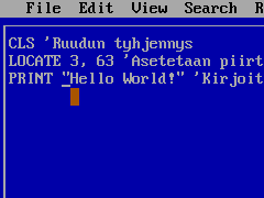CLS 'Ruudun tyhjennys LOCATE 3, 63 'Asetetaan piirtokohta riville 3, sarkaimelle 63 PRINT "Hello World!" 'Kirjoittaminen