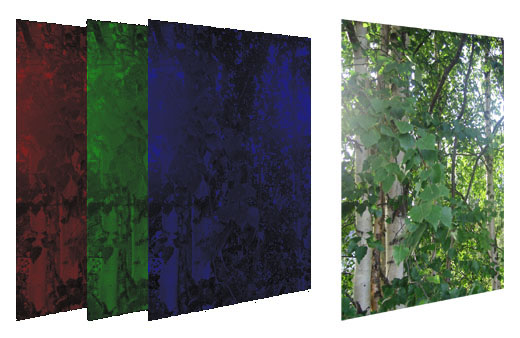 Tällainen kuva muodostuu kolmesta kanavasta: punaisesta, sinisestä ja vihreästä. Kanavat ovat mustavalkoisia kuvia, joissa vaalea tarkoittaa enemmän kyseisen kanavan väriä ja musta vähemmän kyseisen kanavan väriä. Kanavat sitten ladotaan päällekän ja päällekäin olevien pikseleiden väriarvot sekoittuvat keskenään.