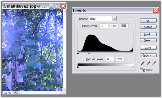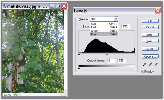 Demonstroinpa tätä ominaisuutta vaikkapa mallikuvamme sinisellä kanavalla. Jos vielä muistat kuinka Levels-kehote toimii, ymmärrät varmasti, mitä alla olevassa kuvassa tapahtuu.