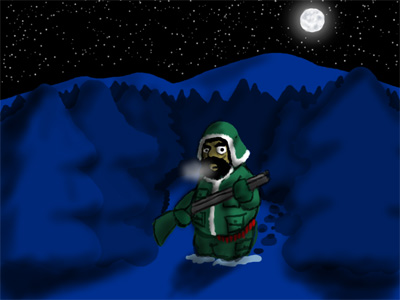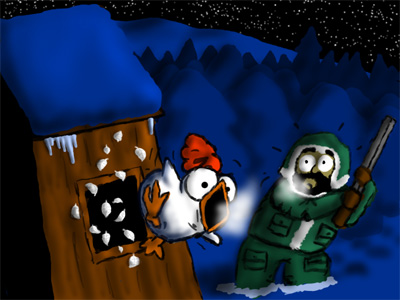 Lumi narahteli Jorman kenkien alla hänen taivaltaessaan järven yli maatilaa kohti. Järveltä katsottuna maatila näytti autiolta, mutta hieman lähempää hän huomasi että kanalasta loisti kyttilän valon kajo. "Hmm, en taida olla ainoana hereillä", Jorma mietti ja suuntasi askeleensa kohti kanalaa. Samassa kanala räjähti korvia huumaavaan kotkotukseen. Jorma vaihtoi kävelystä juoksuun ja säntäsi nopeasti kanalaa kohti. Hän ehti kuitenkin ottaa vain pari askelta, kun kanalan ikkuna pirstoutui palasiksi ja lumeen lensi kovaan ääneen kiekuva möykky höyheniä. Kaikki kotkotus lakkasi.